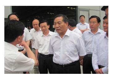 (圖一)2011年11月8日,河南省省委書記盧展工(右一)在商丘市市委書記陶明倫(右二)等領導的陪同下視察河南松川汽車公司并與公司總經理劉飛(左一)親切交談;